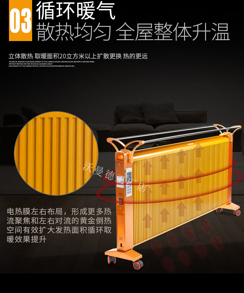 碳晶原子以“布朗運動”原理為基礎通過遠紅外制熱,熱轉換率可達99.8%。,全面散熱,比普通的電暖器熱量提高1倍,帶萬向輪底座,膨脹螺絲,壁掛,移動,方便好用,讓室內不在干燥。